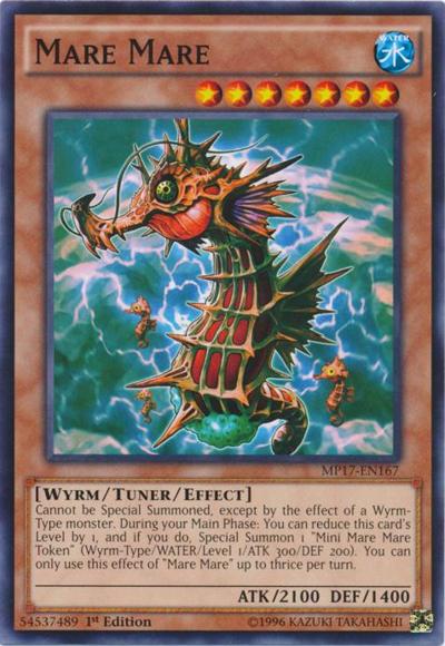 Cannot be Special Summoned, except by the effect of a Wyrm-Type monster. During your Main Phase: You can reduce this card’s Level by 1, and if you do, Special Summon 1 ‘Mini Mare Mare Token’ (Wyrm-Type/WATER/Level 1/ATK 300/DEF 200). You can only use this effect of ‘Mare Mare’ up to thrice per turn.