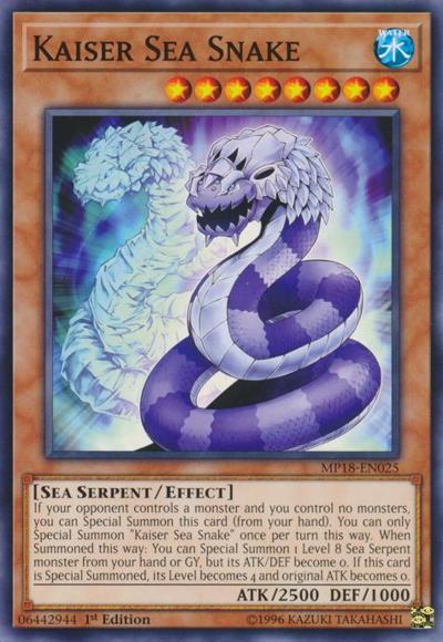 If your opponent controls a monster and you control no monsters, you can Special Summon this card (from your hand). You can only Special Summon ‘Kaiser Sea Snake’ once per turn this way. When Summoned this way: You can Special Summon 1 Level 8 Sea Serpent monster from your hand or GY, but its ATK/DEF become 0. If this card is Special Summoned, its Level becomes 4 and original ATK becomes 0.