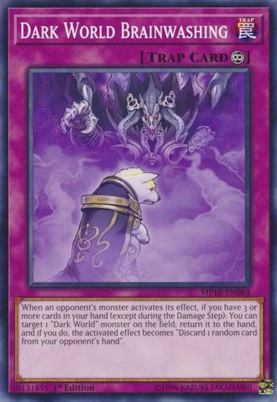 When an opponent’s monster activates its effect, if you have 3 or more cards in your hand (except during the Damage Step): You can target 1 ‘Dark World’ monster on the field; return it to the hand, and if you do, the activated effect becomes ‘Discard 1 random card from your opponent’s hand’.