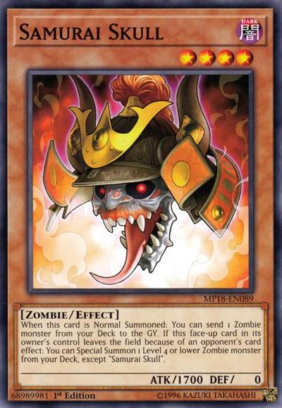 When this card is Normal Summoned: You can send 1 Zombie monster from your Deck to the GY. If this face-up card in its owner’s control leaves the field because of an opponent’s card effect: You can Special Summon 1 Level 4 or lower Zombie monster from your Deck, except ‘Samurai Skull’.