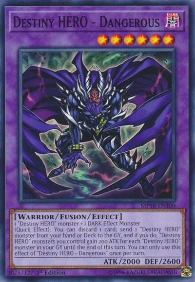 1 ‘Destiny HERO’ monster + 1 DARK Effect Monster(Quick Effect): You can discard 1 card; send 1 ‘Destiny HERO’ monster from your hand or Deck to the GY, and if you do, ‘Destiny HERO’ monsters you control gain 200 ATK for each ‘Destiny HERO’ monster in your GY until the end of this turn. You can only use this effect of ‘Destiny HERO – Dangerous’ once per turn.
