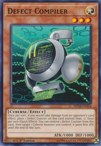 Once per turn, if you would take damage from an opponent’s card effect, place 1 Defect Counter on this card instead (max. 1). Once per turn (Quick Effect): You can remove 1 Defect Counter from this card, then target 1 Cyberse monster you control; it gains 800 ATK until the end of this turn.