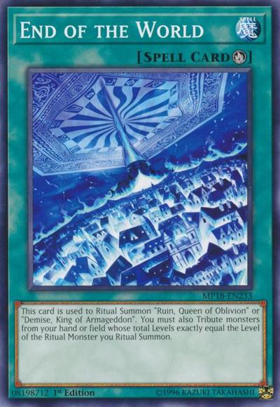 This card is used to Ritual Summon ‘Ruin, Queen of Oblivion’ or ‘Demise, King of Armageddon’. You must also Tribute monsters from your hand or field whose total Levels exactly equal the Level of the Ritual Monster you Ritual Summon.