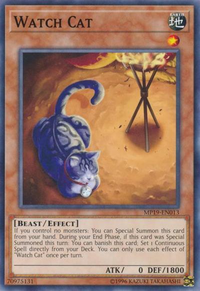 If you control no monsters: You can Special Summon this card from your hand. During your End Phase, if this card was Special Summoned this turn: You can banish this card; Set 1 Continuous Spell directly from your Deck. You can only use each effect of ‘Watch Cat’ once per turn.