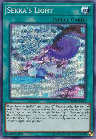 If you have no Spells/Traps in your GY: Draw 2 cards, also, for the rest of this Duel after you activate this card, you cannot activate Spell/Trap Cards or effects, except ‘Sekka’s Light’. You can banish this card from your GY; reveal 1 monster in your hand, shuffle it into the Deck, then, draw 1 card. You can only use each effect of ‘Sekka’s Light’ once per turn.