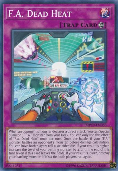 When an opponent’s monster declares a direct attack: You can Special Summon 1 ‘F.A.’ monster from your Deck. You can only use this effect of ‘F.A. Dead Heat’ once per turn. Once per battle, if your ‘F.A.’ monster battles an opponent’s monster, before damage calculation: You can have both players roll a six-sided die. If your result is higher, increase the Level of your battling monster by 4, until the end of this turn (even if this card leaves the field). If your result is lower, destroy your battling monster. If it’s a tie, both players roll again.