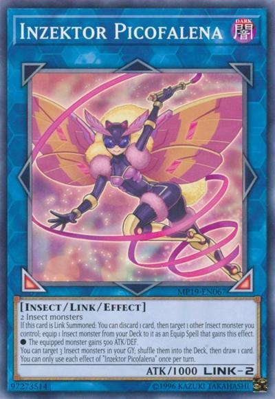 2 Insect monstersIf this card is Link Summoned: You can discard 1 card, then target 1 other Insect monster you control; equip 1 Insect monster from your Deck to it as an Equip Spell that gains this effect.● The equipped monster gains 500 ATK/DEF.You can target 3 Insect monsters in your GY; shuffle them into the Deck, then draw 1 card. You can only use each effect of ‘Inzektor Picofalena’ once per turn.