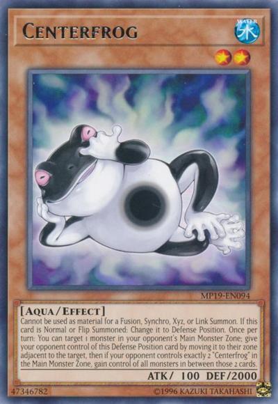 Cannot be used as material for a Fusion, Synchro, Xyz, or Link Summon. If this card is Normal or Flip Summoned: Change it to Defense Position. Once per turn: You can target 1 monster in your opponent’s Main Monster Zone; give your opponent control of this Defense Position card by moving it to their zone adjacent to the target, then if your opponent controls exactly 2 ‘Centerfrog’ in the Main Monster Zone, gain control of all monsters in between those 2 cards.