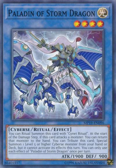 You can Ritual Summon this card with ‘Cynet Ritual’. At the start of the Damage Step, if this card attacks a monster: You can return that monster to the hand. You can Tribute this card; Special Summon 1 Level 5 or higher Cyberse monster from your hand or Deck, but it cannot activate its effects this turn. You can only use each effect of ‘Paladin of Storm Dragon’ once per turn.