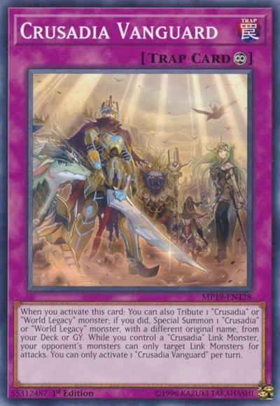 When you activate this card: You can also Tribute 1 ‘Crusadia’ or ‘World Legacy’ monster; if you did, Special Summon 1 ‘Crusadia’ or ‘World Legacy’ monster, with a different original name, from your Deck or GY. While you control a ‘Crusadia’ Link Monster, your opponent’s monsters can only target Link Monsters for attacks. You can only activate 1 ‘Crusadia Vanguard’ per turn.
