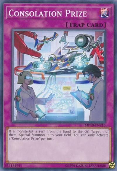 If a monster(s) is sent from the hand to the GY: Target 1 of them; Special Summon it to your field. You can only activate 1 ‘Consolation Prize’ per turn.