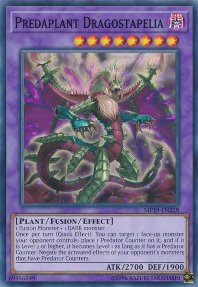 1 Fusion Monster + 1 DARK monsterOnce per turn (Quick Effect): You can target 1 face-up monster your opponent controls; place 1 Predator Counter on it, and if it is Level 2 or higher, it becomes Level 1 as long as it has a Predator Counter. Negate the activated effects of your opponent’s monsters that have Predator Counters.