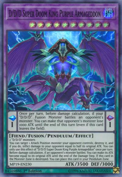 Pendulum EffectOnce per turn, before damage calculation, if your ‘D/D/D’ Fusion Monster battles an opponent’s monster: You can make that opponent’s monster lose 1000 ATK until the end of this turn (even if this card leaves the field).Monster Effect2 ‘D/D/D’ monstersYou can target 1 Attack Position monster your opponent controls; destroy it, and if you do, inflict damage to your opponent equal to half its original ATK. You can only use this effect of ‘D/D/D Super Doom King Purple Armageddon’ once per turn. Before damage calculation, if an opponent’s monster battles: You can make its ATK become equal to its original ATK until the end of the Damage Step. If this card in the Monster Zone is destroyed: You can place this card in your Pendulum Zone.