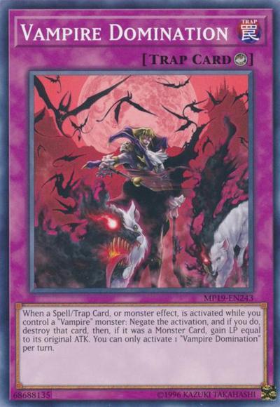 When a Spell/Trap Card, or monster effect, is activated while you control a ‘Vampire’ monster: Negate the activation, and if you do, destroy that card, then, if it was a Monster Card, gain LP equal to its original ATK. You can only activate 1 ‘Vampire Domination’ per turn.