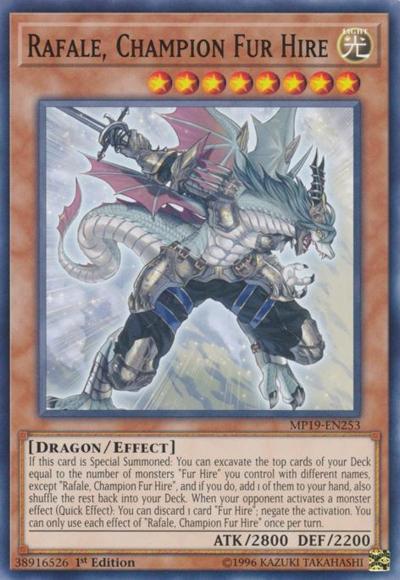 If this card is Special Summoned: You can excavate the top cards of your Deck equal to the number of monsters ‘Fur Hire’ you control with different names, except ‘Rafale, Champion Fur Hire’, and if you do, add 1 of them to your hand, also shuffle the rest back into your Deck. When your opponent activates a monster effect (Quick Effect): You can discard 1 card ‘Fur Hire’; negate the activation. You can only use each effect of ‘Rafale, Champion Fur Hire’ once per turn.