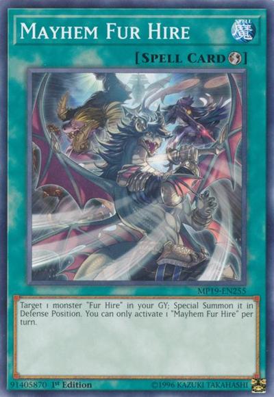 Target 1 monster ‘Fur Hire’ in your GY; Special Summon it in Defense Position. You can only activate 1 ‘Mayhem Fur Hire’ per turn.