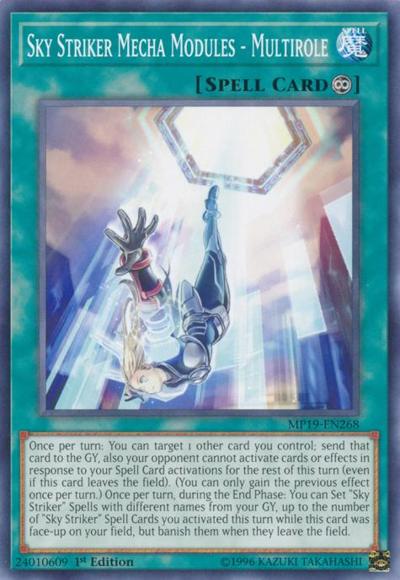 Once per turn: You can target 1 other card you control; send that card to the GY, also your opponent cannot activate cards or effects in response to your Spell Card activations for the rest of this turn (even if this card leaves the field). (You can only gain the previous effect once per turn.) Once per turn, during the End Phase: You can Set ‘Sky Striker’ Spells with different names from your GY, up to the number of ‘Sky Striker’ Spell Cards you activated this turn while this card was face-up on your field, but banish them when they leave the field.