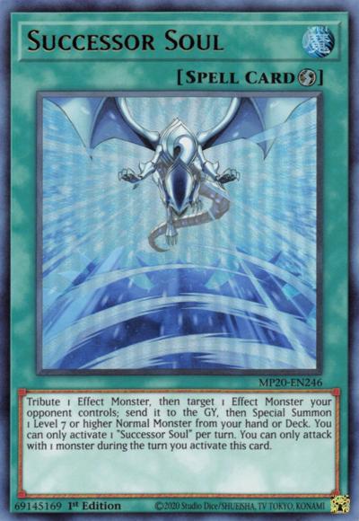 Tribute 1 Effect Monster, then target 1 Effect Monster your opponent controls; send it to the GY, then Special Summon 1 Level 7 or higher Normal Monster from your hand or Deck. You can only activate 1 ‘Successor Soul’ per turn. You can only attack with 1 monster during the turn you activate this card.