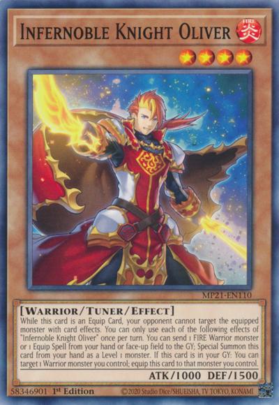 While this card is an Equip Card, your opponent cannot target the equipped monster with card effects. You can only use each of the following effects of ‘Infernoble Knight Oliver’ once per turn. You can send 1 FIRE Warrior monster or 1 Equip Spell from your hand or face-up field to the GY; Special Summon this card from your hand as a Level 1 monster. If this card is in your GY: You can target 1 Warrior monster you control; equip this card to that monster you control.
