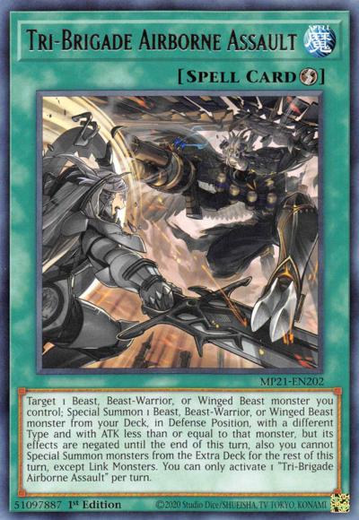 Target 1 Beast, Beast-Warrior, or Winged Beast monster you control; Special Summon 1 Beast, Beast-Warrior, or Winged Beast monster from your Deck, in Defense Position, with a different Type and with ATK less than or equal to that monster, but its effects are negated until the end of this turn, also you cannot Special Summon monsters from the Extra Deck for the rest of this turn, except Link Monsters. You can only activate 1 ‘Tri-Brigade Airborne Assault’ per turn.