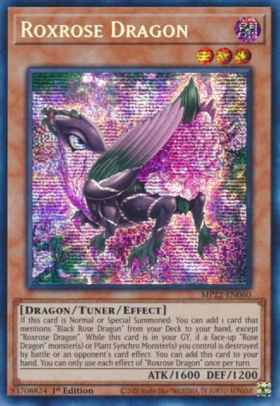 If this card is Normal or Special Summoned: You can add 1 card that specifically lists ‘Black Rose Dragon’ in its text, from your Deck to your hand, except ‘Roxrose Dragon’. While this card is in your GY, if a face-up ‘Rose Dragon’ monster(s) or Plant Synchro Monster(s) you control is destroyed by battle or an opponent’s card effect: You can add this card to your hand. You can only use each effect of ‘Roxrose Dragon’ once per turn.