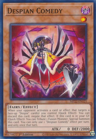 When your opponent activates a card or effect that targets a face-up ‘Despia’ card(s) you control (Quick Effect): You can discard this card; negate that effect. If this card is in your GY (Quick Effect): You can Tribute 1 Fusion Monster; Special Summon this card. You can only use 1 ‘Despian Comedy’ effect per turn, and only once that turn.