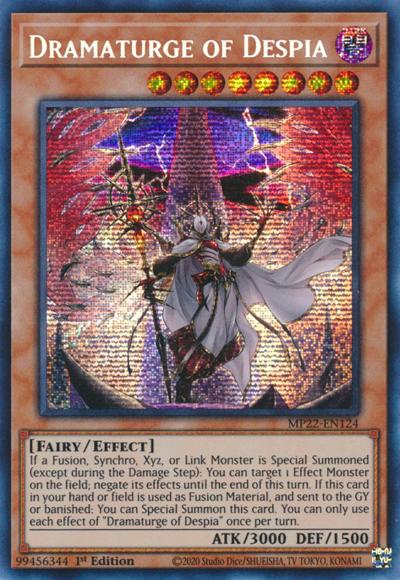 If a Fusion, Synchro, Xyz, or Link Monster is Special Summoned (except during the Damage Step): You can target 1 Effect Monster on the field; negate its effects until the end of this turn. If this card in your hand or field is used as Fusion Material, and sent to the GY or banished: You can Special Summon this card. You can only use each effect of ‘Dramaturge of Despia’ once per turn.