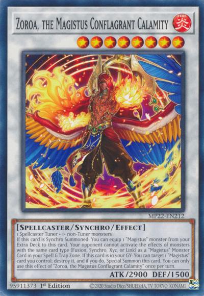 1 Spellcaster Tuner + 1+ non-Tuner monstersIf this card is Synchro Summoned: You can equip 1 ‘Magistus’ monster from your Extra Deck to this card. Your opponent cannot activate the effects of monsters with the same card type (Fusion, Synchro, Xyz, or Link) as a ‘Magistus’ Monster Card in your Spell & Trap Zone. If this card is in your GY: You can target 1 ‘Magistus’ card you control; destroy it, and if you do, Special Summon this card. You can only use this effect of ‘Zoroa, the Magistus Conflagrant Calamity’ once per turn.