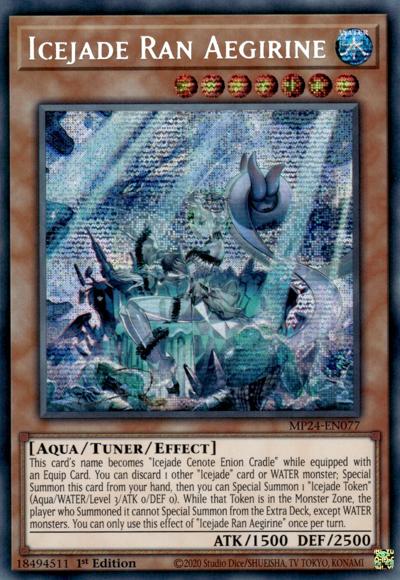 This card’s name becomes ‘Icejade Cenote Enion Cradle’ while equipped with an Equip Card. You can discard 1 other ‘Icejade’ card or WATER monster; Special Summon this card from your hand, then you can Special Summon 1 ‘Icejade Token’ (Aqua/WATER/Level 3/ATK 0/DEF 0). While that Token is in the Monster Zone, the player who Summoned it cannot Special Summon monsters from the Extra Deck, except WATER monsters. You can only use this effect of ‘Icejade Ran Aegirine’ once per turn.