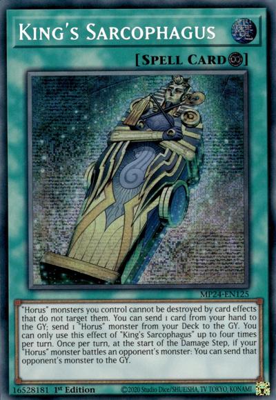 ‘Horus’ monsters you control cannot be destroyed by card effects that do not target them. You can send 1 card from your hand to the GY; send 1 ‘Horus’ monster from your Deck to the GY. You can only use this effect of ‘King’s Sarcophagus’ up to four times per turn. Once per turn, at the start of the Damage Step, if your ‘Horus’ monster battles an opponent’s monster: You can send that opponent’s monster to the GY.