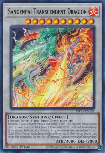 1 Dragon Tuner + 1+ non-Tuner Dragon monstersAll monsters your opponent controls must attack, if able. Your opponent cannot activate cards or effects during the Battle Phase. If this card is Synchro Summoned: You can change all monsters on the field to Attack Position. If 3 or more attacks have been declared this turn (Quick Effect): You can Special Summon this card from your GY, then you can destroy 1 card on the field. You can only use this effect of ‘Sangenpai Transcendent Dragion’ once per Duel.