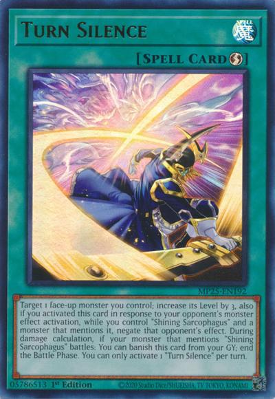 Target 1 face-up monster you control; increase its Level by 3, also if you activated this card in response to your opponent’s monster effect activation, while you control ‘Shining Sarcophagus’ and a monster that mentions it, negate that opponent’s effect. During damage calculation, if your monster that mentions ‘Shining Sarcophagus’ battles: You can banish this card from your GY; end the Battle Phase. You can only activate 1 ‘Turn Silence’ per turn.