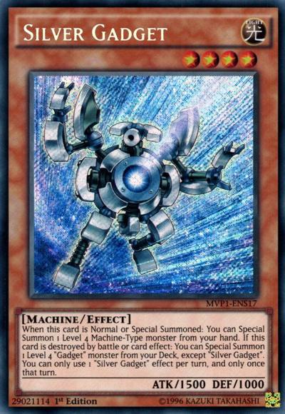 When this card is Normal or Special Summoned: You can Special Summon 1 Level 4 Machine monster from your hand. If this card is destroyed by battle or card effect: You can Special Summon 1 Level 4 ‘Gadget’ monster from your Deck, except ‘Silver Gadget’. You can only use 1 ‘Silver Gadget’ effect per turn, and only once that turn.