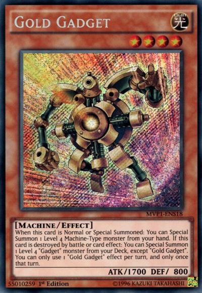 When this card is Normal or Special Summoned: You can Special Summon 1 Level 4 Machine monster from your hand. If this card is destroyed by battle or card effect: You can Special Summon 1 Level 4 ‘Gadget’ monster from your Deck, except ‘Gold Gadget’. You can only use 1 ‘Gold Gadget’ effect per turn, and only once that turn.