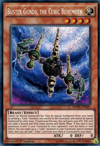 Cannot be Normal Summoned/Set. Must be Special Summoned (from your hand) by sending 3 ‘Cubic’ monsters you control to the Graveyard, and cannot be Special Summoned by other ways. If Summoned this way, this card gains 3000 ATK. This card can make a second and third attack during each Battle Phase. If this card in your possession is sent to your Graveyard by your opponent’s card (by battle or card effect): You can target up to 3 ‘Cubic’ monsters in your Graveyard; Special Summon them, then you can add 1 ‘Cubic’ card from your Deck or Graveyard to your hand.