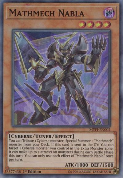 You can Tribute 1 Cyberse monster; Special Summon 1 ‘Mathmech’ monster from your Deck. If this card is sent to the GY: You can target 1 Cyberse monster you control in the Extra Monster Zone; it can make up to 2 attacks on monsters during each Battle Phase this turn. You can only use each effect of ‘Mathmech Nabla’ once per turn.