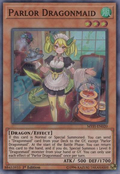 If this card is Normal or Special Summoned: You can send 1 ‘Dragonmaid’ card from your Deck to the GY, except ‘Parlor Dragonmaid’. At the start of the Battle Phase: You can return this card to the hand, and if you do, Special Summon 1 Level 8 ‘Dragonmaid’ monster from your hand or GY. You can only use each effect of ‘Parlor Dragonmaid’ once per turn.