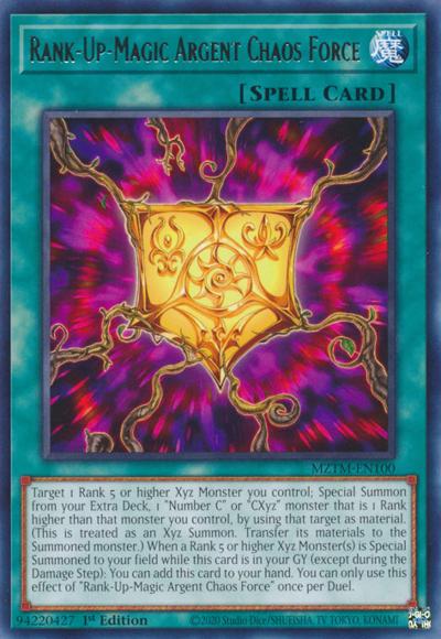 Target 1 Rank 5 or higher Xyz Monster you control; Special Summon from your Extra Deck, 1 ‘Number C’ or ‘CXyz’ monster that is 1 Rank higher than that monster you control, by using it as the Xyz Material. (This Special Summon is treated as an Xyz Summon. Xyz Materials attached to it also become Xyz Materials on the Summoned monster.) When a Rank 5 or higher Xyz Monster(s) is Special Summoned to your side of the field while this card is in your Graveyard (except during the Damage Step): You can add this card from the Graveyard to your hand. You can only use this effect of ‘Rank-Up-Magic Argent Chaos Force’ once per Duel.