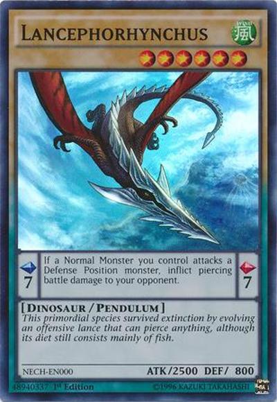 Pendulum EffectIf a Normal Monster you control attacks a Defense Position monster, inflict piercing battle damage to your opponent.Monster EffectThis primordial species survived extinction by evolving an offensive lance that can pierce anything, although its diet still consists mainly of fish.
