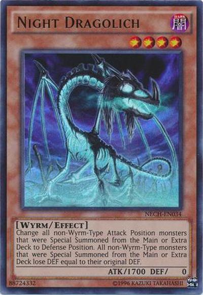 Change all non-Wyrm-Type Attack Position monsters that were Special Summoned from the Main or Extra Deck to Defense Position. All non-Wyrm-Type monsters that were Special Summoned from the Main or Extra Deck lose DEF equal to their original DEF.