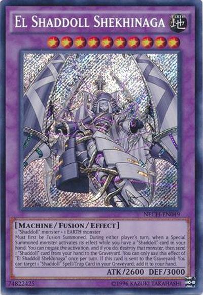 1 ‘Shaddoll’ monster + 1 EARTH monsterMust first be Fusion Summoned. During either player’s turn, when a Special Summoned monster activates its effect while you have a ‘Shaddoll’ card in your hand: You can negate the activation, and if you do, destroy that monster, then send 1 ‘Shaddoll’ card from your hand to the Graveyard. You can only use this effect of ‘El Shaddoll Shekhinaga’ once per turn. If this card is sent to the Graveyard: You can target 1 ‘Shaddoll’ Spell/Trap Card in your Graveyard; add it to your hand.
