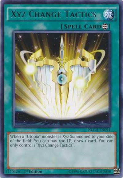 When a ‘Utopia’ monster is Xyz Summoned to your field: You can pay 500 LP; draw 1 card. You can only control 1 ‘Xyz Change Tactics’.
