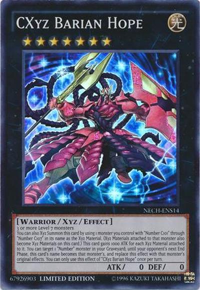 3 or more Level 7 monstersYou can also Xyz Summon this card by using 1 monster you control with ‘Number C101’ through ‘Number C107’ in its name as the Xyz Material. (Xyz Materials attached to that monster also become Xyz Materials on this card.) This card gains 1000 ATK for each Xyz Material attached to it. You can target 1 ‘Number’ monster in your Graveyard; until your opponent’s next End Phase, this card’s name becomes that monster’s, and replace this effect with that monster’s original effects. You can only use this effect of ‘CXyz Barian Hope’ once per turn.