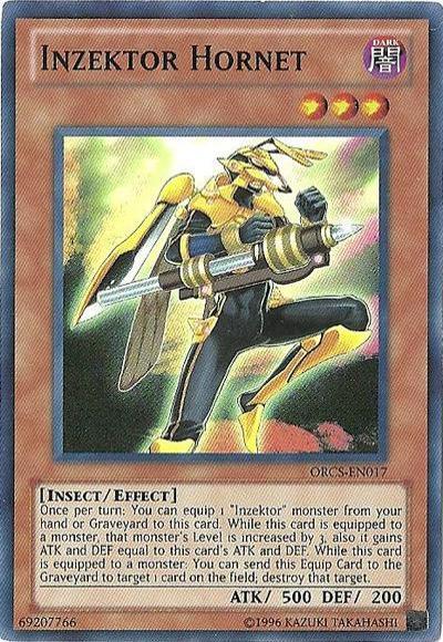 Once per turn: You can equip 1 ‘Inzektor’ monster from your hand or Graveyard to this card. While this card is equipped to a monster, that monster’s Level is increased by 3, also it gains ATK and DEF equal to this card’s ATK and DEF. While this card is equipped to a monster: You can send this Equip Card to the Graveyard to target 1 card on the field; destroy that target.