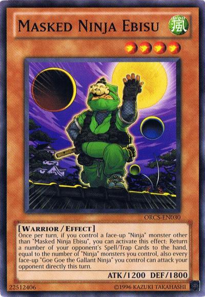 Once per turn, if you control a face-up ‘Ninja’ monster other than ‘Masked Ninja Ebisu’, you can activate this effect: Return a number of your opponent’s Spell/Trap Cards to the hand, equal to the number of ‘Ninja’ monsters you control, also every face-up ‘Goe Goe the Gallant Ninja’ you control can attack your opponent directly this turn.