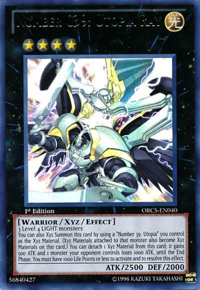 3 Level 4 LIGHT monstersYou can also Xyz Summon this card by using a ‘Number 39: Utopia’ you control as the Xyz Material. (Xyz Materials attached to that monster also become Xyz Materials on this card.) You can detach 1 Xyz Material from this card; it gains 500 ATK and 1 monster your opponent controls loses 1000 ATK, until the End Phase. You must have 1000 Life Points or less to activate and to resolve this effect.