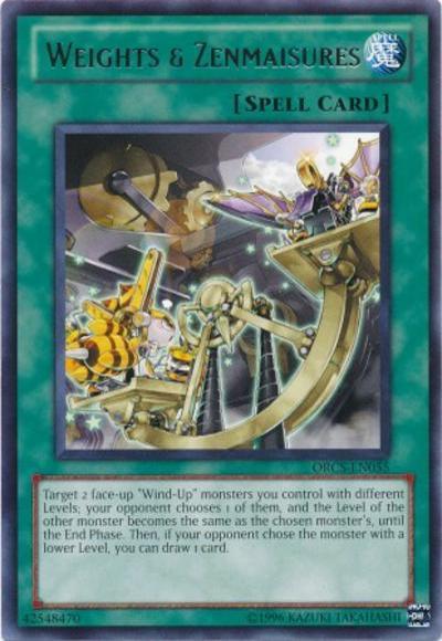 Target 2 face-up ‘Wind-Up’ monsters you control with different Levels; your opponent chooses 1 of them, and the Level of the other monster becomes the same as the chosen monster’s, until the End Phase. Then, if your opponent chose the monster with a lower Level, you can draw 1 card.