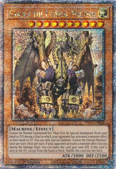 Cannot be Normal Summoned/Set. Must first be Special Summoned (from your hand or GY) during a Duel in which your opponent has activated a monster effect in their hand or GY. You can only Special Summon ‘Carnot the Eternal Machine’ once per turn. Once per turn, if your opponent activates a monster effect (except during the Damage Step): You can make this card gain 1000 ATK. If this card is sent to the GY, except from the hand or Deck: Shuffle this card into the Deck.