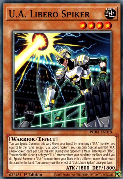 You can Special Summon this card (from your hand) by returning 1 ‘U.A.’ monster you control to the hand, except ‘U.A. Libero Spiker’. You can only Special Summon ‘U.A. Libero Spiker’ once per turn this way. During your opponent’s Main Phase (Quick Effect): You can shuffle 1 Level 5 or higher ‘U.A.’ monster from your hand into the Deck, and if you do, Special Summon 1 ‘U.A.’ monster from your Deck with a different name, then return this card to the hand. You can only use this effect of ‘U.A. Libero Spiker’ once per turn.