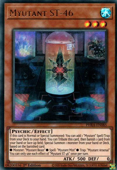 If this card is Normal or Special Summoned: You can add 1 ‘Myutant’ Spell/Trap from your Deck to your hand. You can Tribute this card, then banish 1 card from your hand or face-up field; Special Summon 1 monster from your hand or Deck, based on the banished card.● Monster: ‘Myutant Beast’ ● Spell: ‘Myutant Mist’ ● Trap: ‘Myutant Arsenal’You can only use each effect of ‘Myutant ST-46’ once per turn.